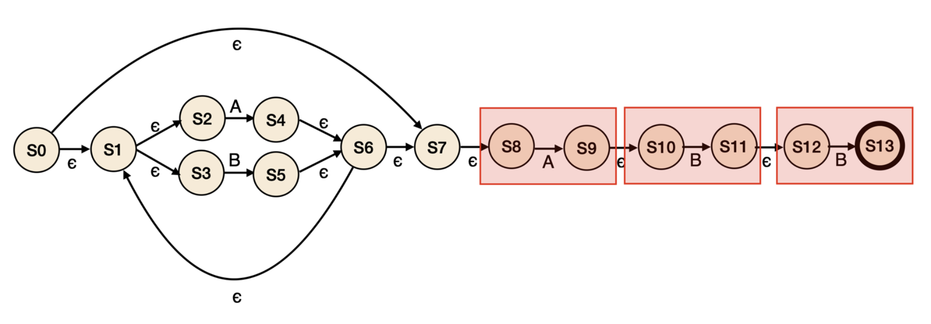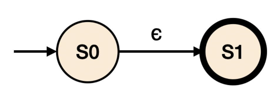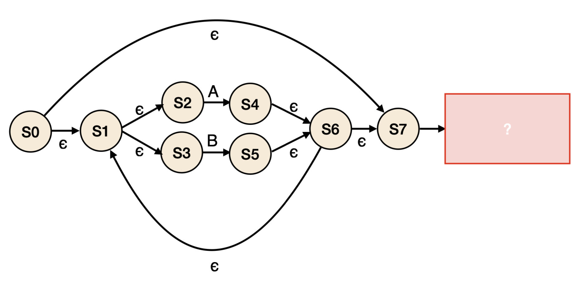 (A|B)* 와 같은 RE 는 위 그림과 같이 ε-movement 를 구성하여 만들 수 있습니다.