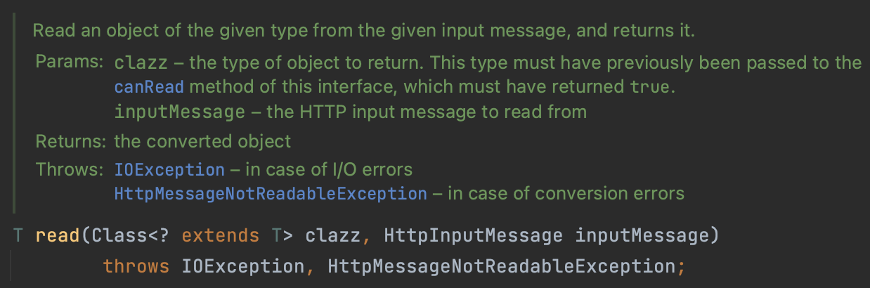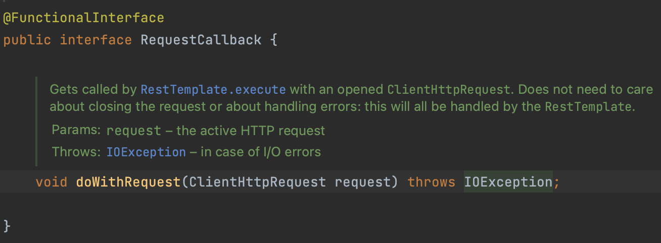RestTemplate 메소드는 HTTP요청을 위해 url, 반환받을 클래스 타입, body 및 header 등등을 파라미터로 전달받습니다. 이를 이용해 RestTemplate는 위와 같은 내부 동작을 거쳐 어플리케이션에게 객체를 리턴합니다.